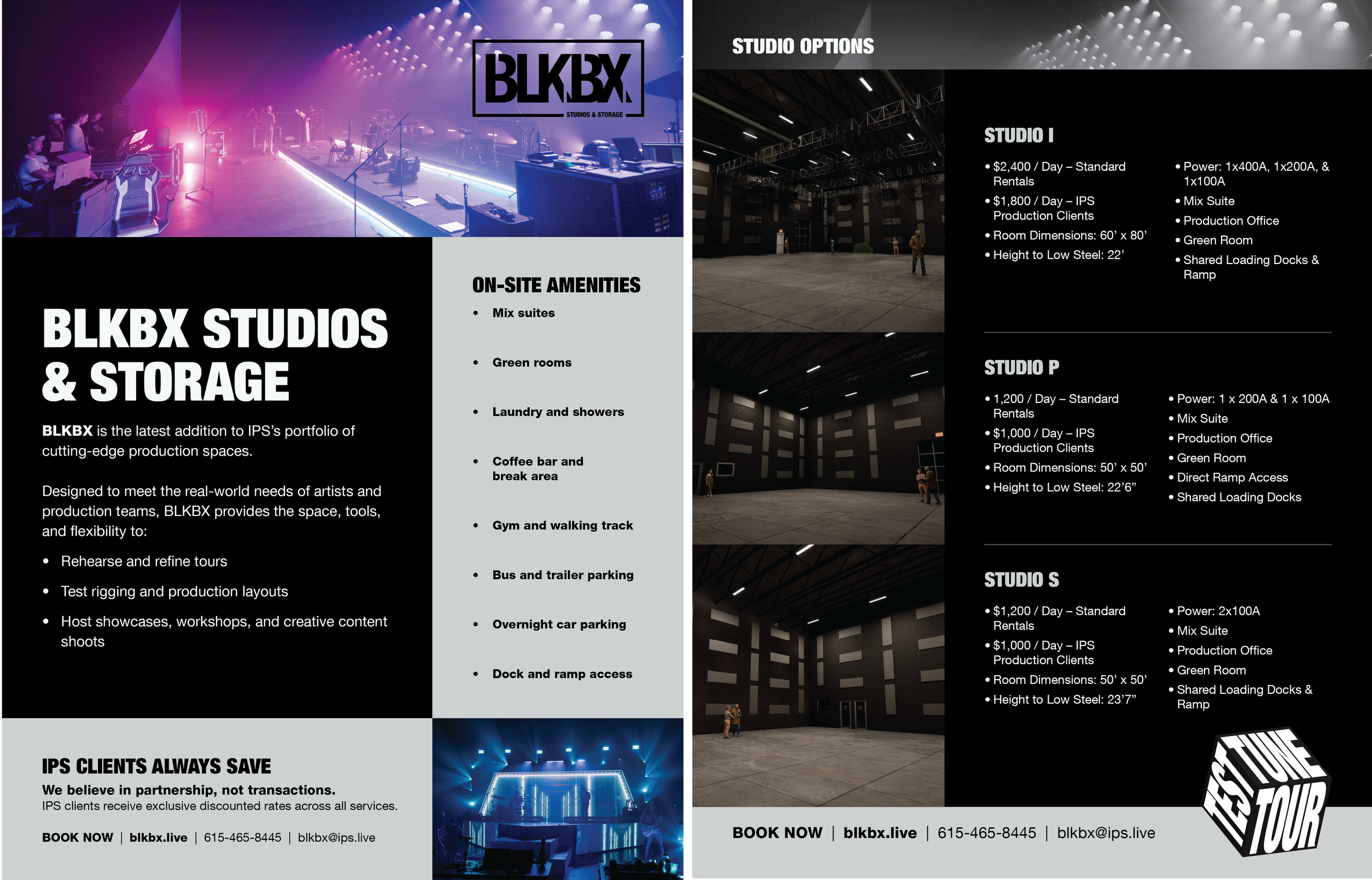 Get ready to experience the next level in tour rehearsals and creative pre-production. IPS is proud to expand BLKBX, our state-of-the-art rehearsal facility located in Franklin, Tennessee. With cutting-edge features, enhanced amenities, and 75,000 square feet of total space, BLKBX is designed to meet the evolving needs of artists and production teams.